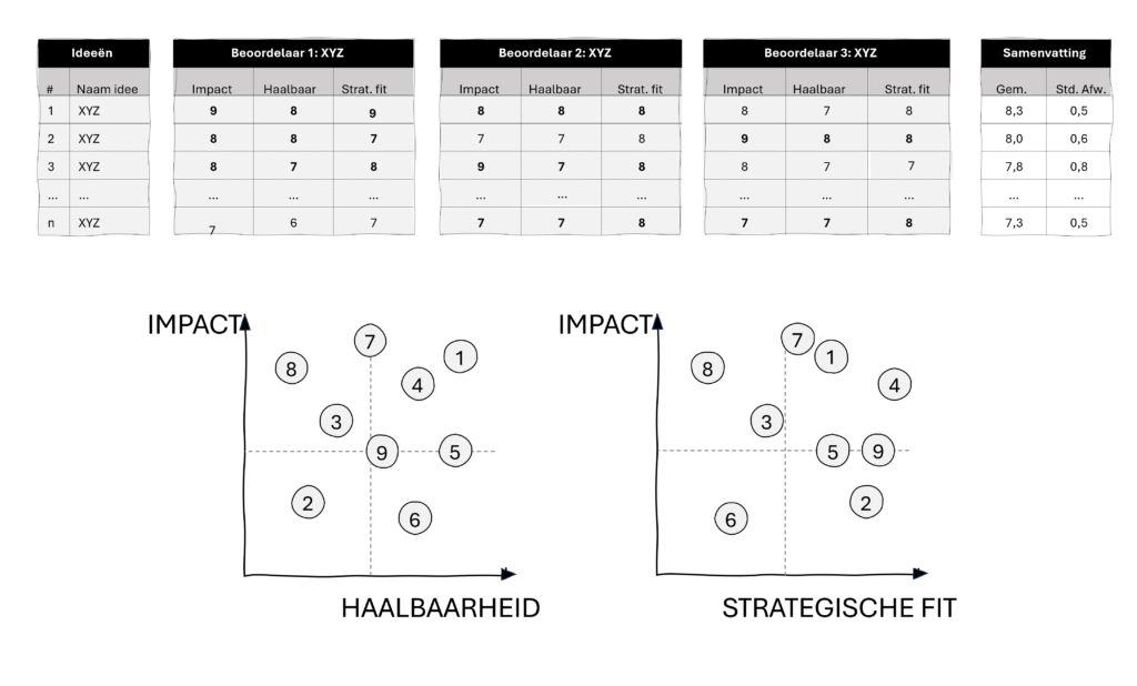 Met de Impact – Haalbaarheid – Strategische Fit scoring kun jij en je team ideeën beoordelen en selecteren om een innovatie stop te zetten of juist verder te ontwikkelen. Je doorloopt vier stappen, waarna je ideeën kunt selecteren op basis van impact, haalbaarheid en strategische fit.