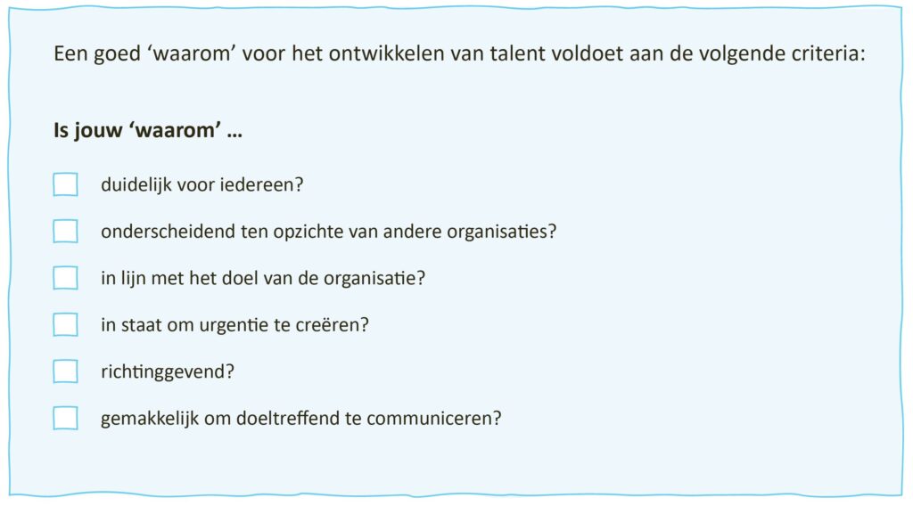 Een goede waarom heeft verschillende kwaliteiten. Het is een authentieke uiting van motivatie, geen loze woorden. Het moet je oprechte waarden en overtuigingen weerspiegelen. Een sterke waarom voor het ontwikkelen van innovatietalent voldoet aan de criteria van de Jouw ‘Waarom’ checklist (H. 5).